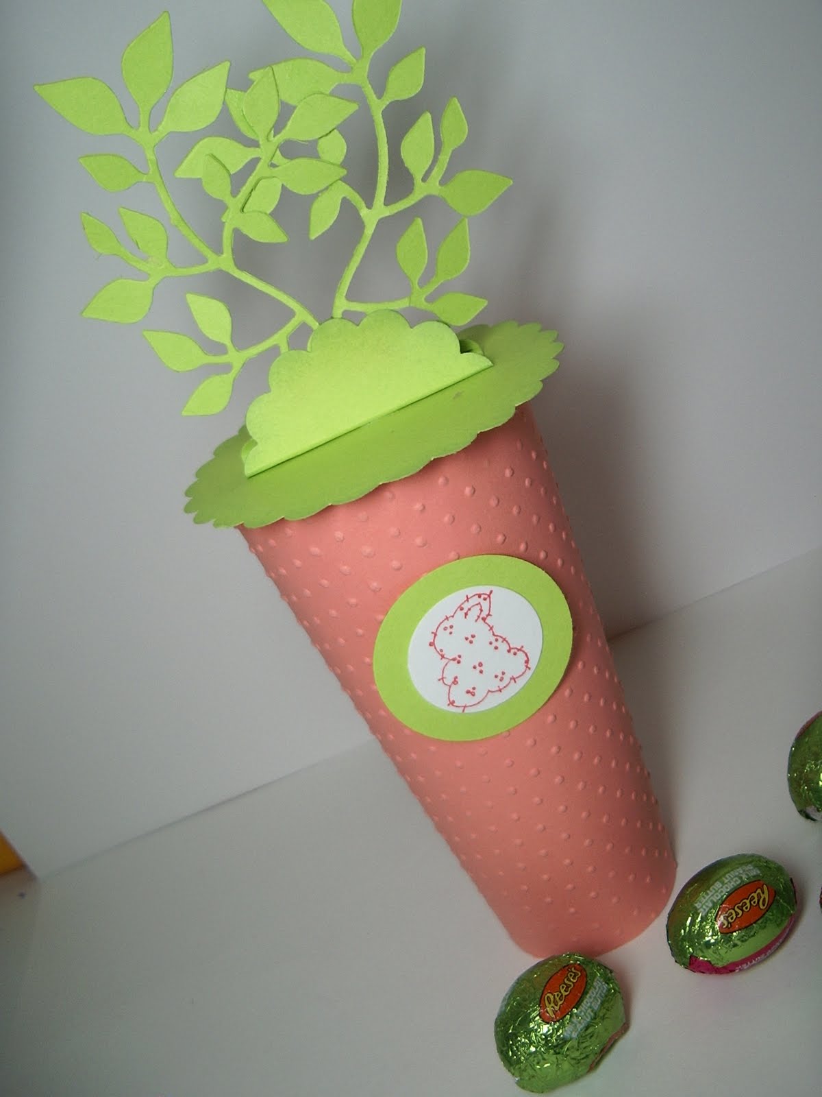 To make the carrot top base, I used a 2-inch paper scalloped circle. I scored two parallel lines down the center of the scallop and folded both sides upward on the score lines (like a flat-bottomed taco shell).